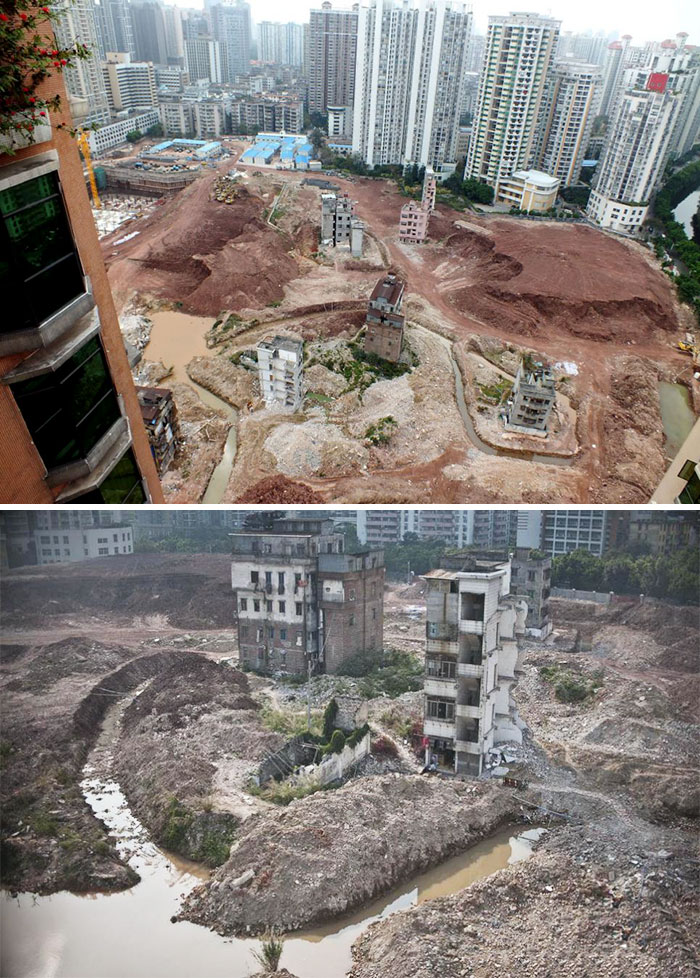Жители этого дома в Китае так упрямились с продажей, что правительство построило дорогу прямо вокруг здания. В конце концов они съехали, но дом стал символом противодействия застройщикам.
