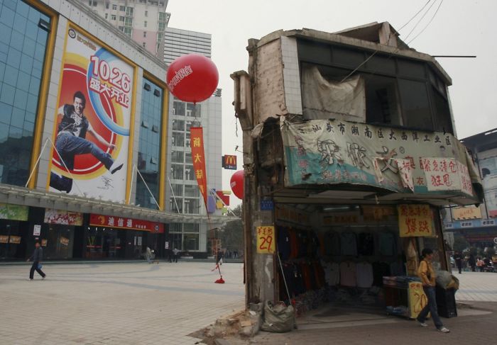 В шанхайском районе Гвангфули покидать свои дома отказались жители сразу нескольких домиков, и теперь их окружают дорогие многоквартирные высотки.