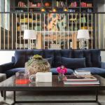 Диван синего цвета в интерьере, оформленном в стиле современная классика