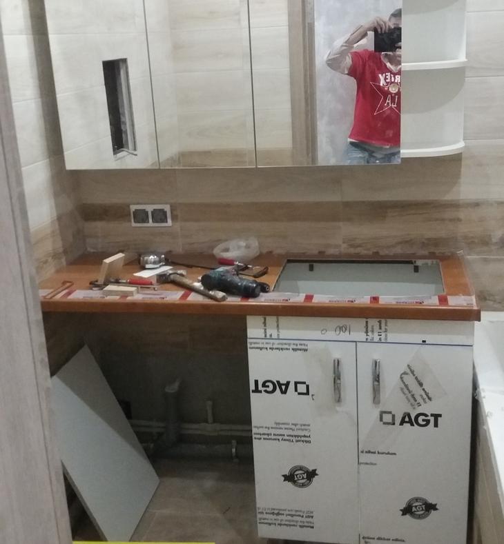 Начал делать мебель в ванную. Почему-то она очень дорогая. В итоге заказал распил из влагостойкого ДСП и уже не помню что на фасады. Ну и зеркало, которое сам наклеил. В качестве столешницы использовал пластиковый подоконник, он влаги не боится.