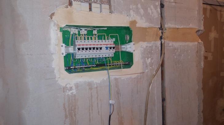 Я продолжал работать с проводкой. Собрал автомат, заложил в стенку гофру под кабель, заштукатурил штрабы.
