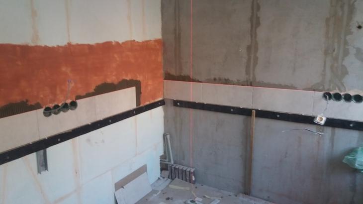 Далее кирпичные стены заштукатурил по маякам. Под обои использовал гипсовую штукатурку, с ней легче работать. Ну а на кухне и в санузле использовал цементную. Параллельно сделал штрабы под новое место полотенцесушителя.