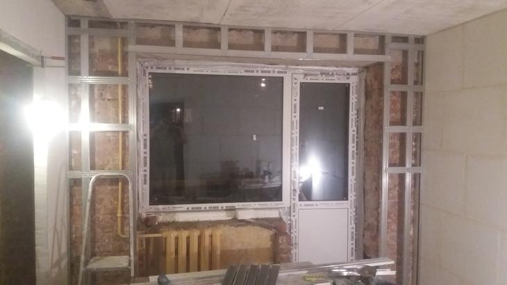 Далее сделал откосы на окнах. Откосы гипсокартонные, клеил их на квадратики.