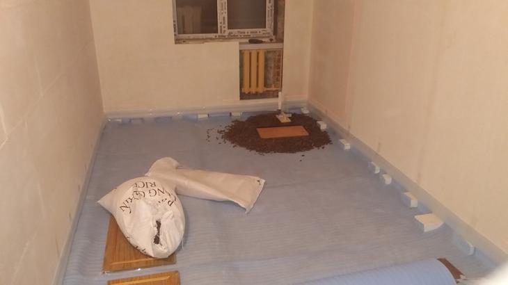 Пришла пора делать пол. Хотел не быть сволочью по отношению к соседям снизу, поэтому на пол положил шумоизоляцию, потом все это засыпал керамзитом. Пришлось делать слой от 3 до 13 сантиметров, про кривые полы писал выше. Раскладка пленки и сетки, если делать не самому, стоила на тот момент 2,7 рубля. Это делается за вечер. Плюс если заказывать под ключ, то и материалы (керамзит, пенопласт) посчитают в 2 раза дороже. В итоге все работы провел сам, а людей вызвал только на стяжку.