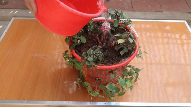 Установите бутылку в центр ведра. Засыпьте её питательным грунтом. Лишнюю длину пластикового пакета отрежьте.