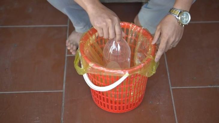 Также подготовьте ведро, которое выстелите внутри пакетом. Примерьте пластиковую бутылку, в которой сверху по кругу сделайте 5-6 отверстий паяльником (или горячим гвоздём, например).