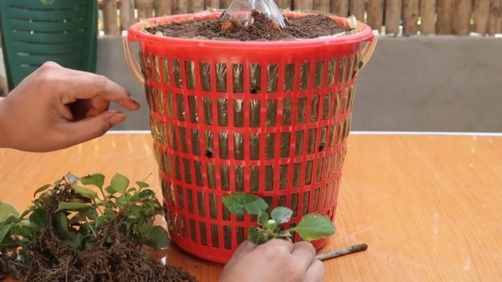 В пакете проделайте несколько отверстий снаружи. Вставьте укоренённые черенки через отверстия внутрь отверстий, в землю.