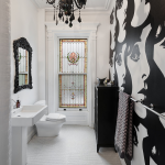 - Чтобы яркая иллюстрация, оформленная резко контрастирующими черно-белыми тонами, органично выглядела на фоне интерьера с нейтральной палитрой, следует комбинировать ее с зеркальными панно или хромированными стеновыми панелями из металла, способными отражать графический рисунок.