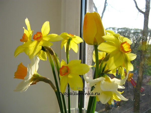 На этом фото хоть тюльпанчик и гармонично вписался в букет нарциссов, но все же лучше цветок поместить в отдельную вазочку.
