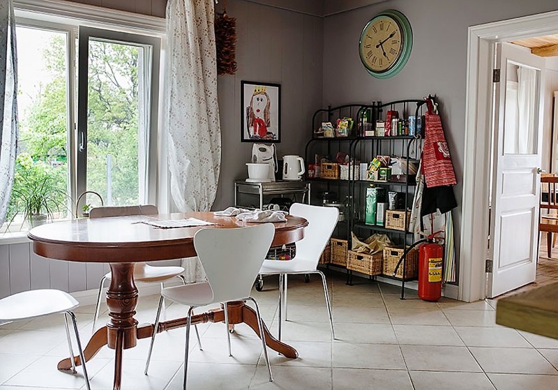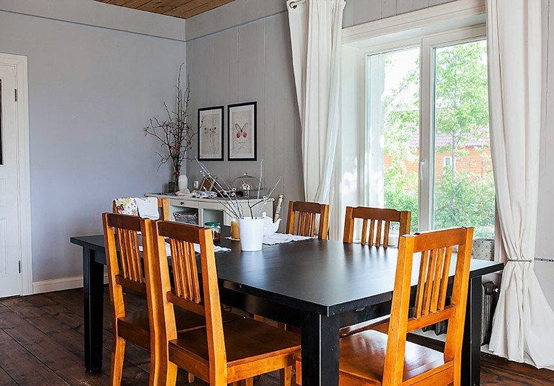 На первом этаже находится гостиная, которая совмещена со столовой. На полу постелили старые оригинальные доски. Пусть они по цвету немного разные, но в этом и есть вся изюминка. И, главное, все это нравится жильцам дома.