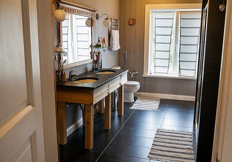 Умывальник Максим тоже сделал сам. Просто купил столешницу из сланца, а стальное изготовил из балясин для лестниц, которые можно купить в любом строительном магазине. Если сами не сможете сделать такую раковину, вы можете ее заказать, только стоит это немалых денег.