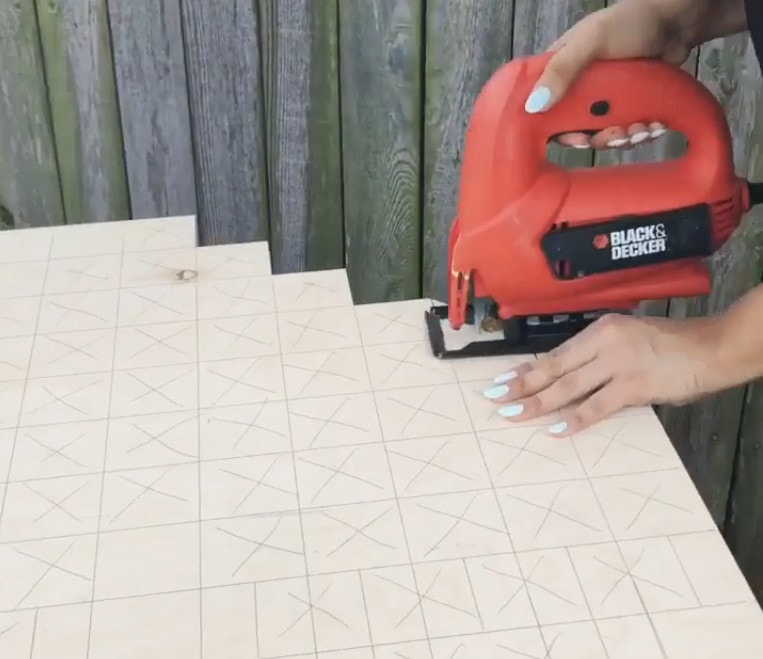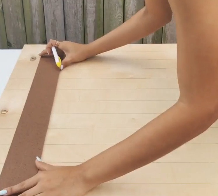 Используя ручную циркулярную пилу, обрежьте лишнюю часть деревянной доски. Зачистите края дерева жесткой наждачной бумагой.