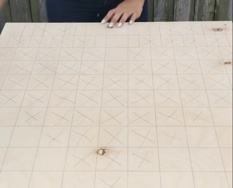Для начала расчертите доску на квадраты со стороной 10 сантиметров.
