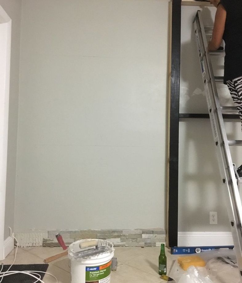Конструкцию, которая поддерживала телевизор и была спрятана под гипсокартон, сделали видимой. Участки вокруг нее зацементировали и подготовили к отделке.