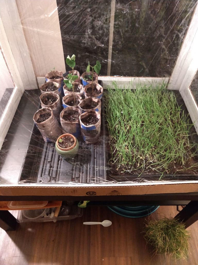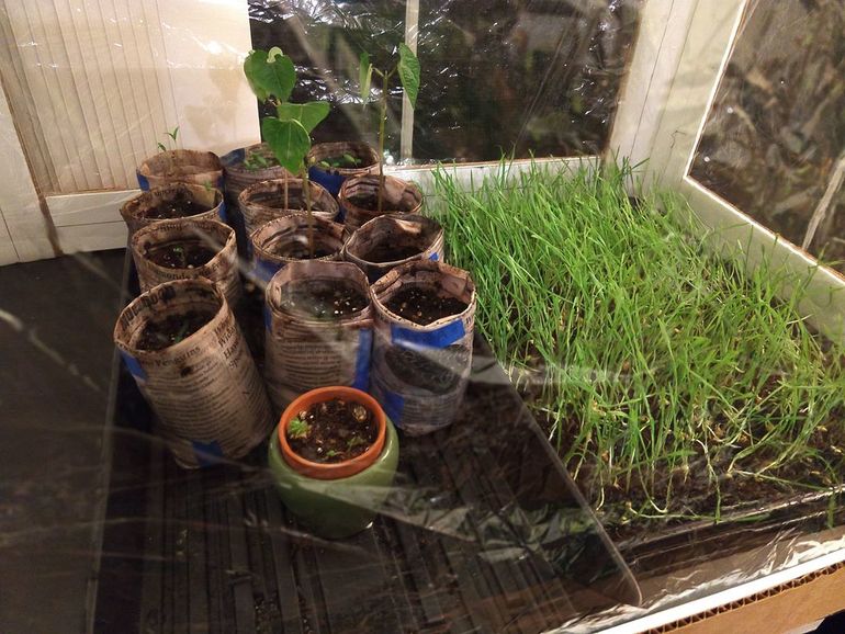 Как видите, у автора мастер-класса уже есть три бобовых растения, и быстро растущие ноготки. Перец и помидоры тоже начинают прорастать. В другом лотке — пырей для его кота. Так как по ночам еще довольно прохладно, целесообразно убирать пырей на ночь в теплицу.
