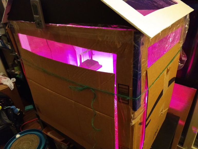 Мужчина из Торонто сделал теплицу для рассады помидор и некоторых других растений. Как видно рассада уже очень большая. Теплица изготовлена из картона и оклеена внутри фольгой. Снаружи покрыта брезентом.