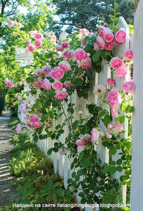 Любой забор перед частным домом украсят цветы. Если сделать деревянный забор из штакетника, а за ним посадить долгоцветущие розы, то можно получить вот такой приятный, благоухающий вариант ограждения. Конечно, сил будет потрачено много, но зато такой забор в палисаднике будет самым красивым во всей округе!