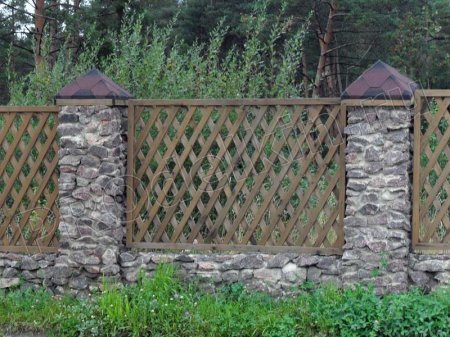 Забор из камня и деревянной решетки