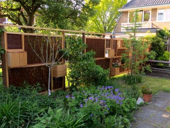 Можно обыграть тему плетня в сочетании в деревянными секциями. На фото представлена интересная идея — забор с ящиками для цветов. В качестве материала для плетня берите ивовые прямые прутья. В среднем лоза на плетне служит до 7 лет. А если ее регулярно покрывать защитным составом, то срок службы вырастает до 10 лет.